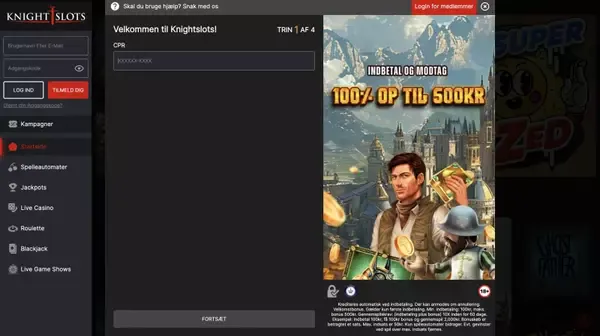 For at tilmelde dig KnightsSlots Casino skal du bruge registreringsknappen på forsiden og vælge Danmark som land, hvis du bliver spurgt. Formularen beder om praktiske oplysninger, der bruges til sikkerhed og betalinger, såsom dit navn, fødselsdato, adresse og kontaktoplysninger. Du vælger også din foretrukne valuta fra den understøttede liste; indbetalinger i Danmark håndteres i DKK med de lokale metoder, der vises i kassen.